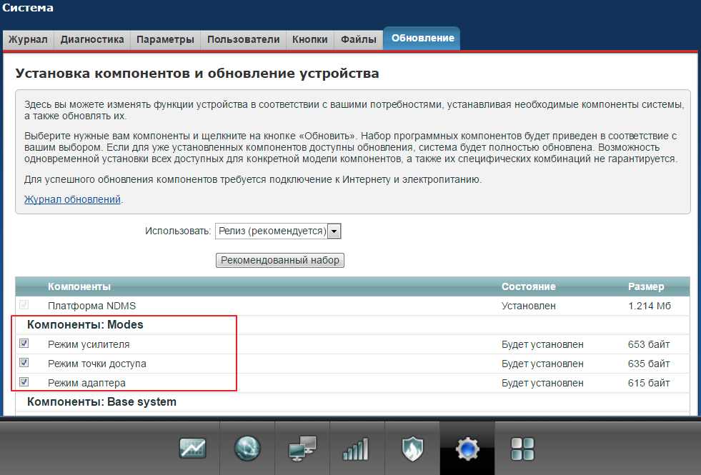 1. Для использования каждого режима, кроме "Интернет-центр — основной режим", должен быть установлен соответствующий компонент (по умолчанию установлены все). Если устройство находилось в каком-то режиме (например, в режиме "Адаптер"), а во время обновления компонентов соответствующий модуль отключили, устройство перейдет в основной режим работы "Интернет-центр".
