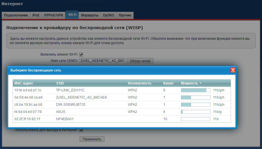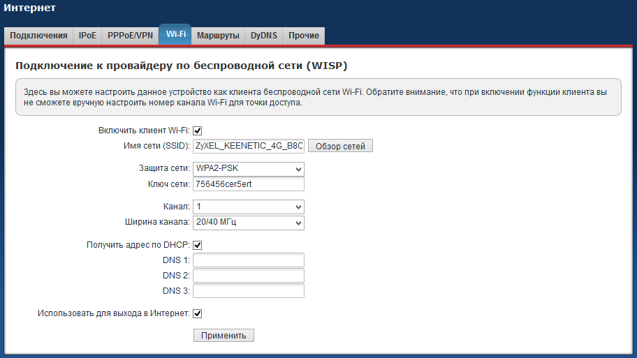 2. Для подключения к беспроводной сети основного роутера (Keenetic 4G) в меню Интернет на закладке Wi-Fi нужно включить режим клиента Wi-Fi и указать параметры точки доступа. По кнопке Обзор сетей выберите нужную беспроводную сеть (SSID) и затем укажите Ключ сети. Поставьте галочку в поле Использовать для выхода в Интернет и нажмите Применить.