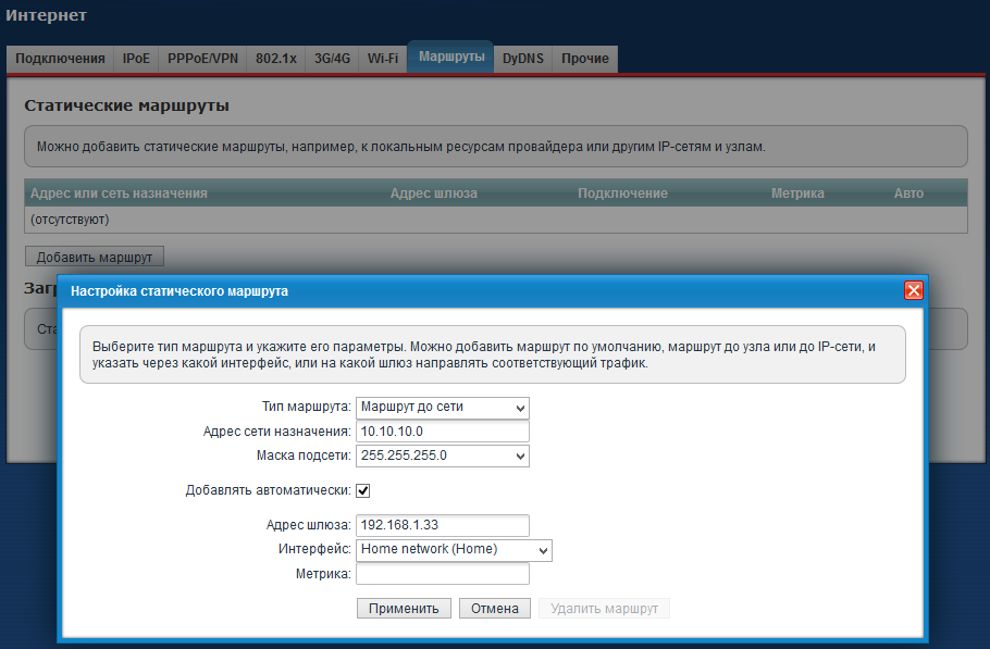 5. Теперь нужно создать статический маршрут для трафика к сети подключенного интернет-центра Keenetic Start. В меню Интернет > Маршруты требуется добавить маршрут до сети 10.10.10.0 маска 255.255.255.0 через шлюз с адресом, зафиксированным для беспроводного клиента Keenetic Start. Параметр Добавлять автоматически следует включить, чтобы маршрут включался всякий раз при подключении данного клиента Wi-Fi к точке доступа на основном роутере. Маршрут должен действовать для интерфейса домашней сети Home network.