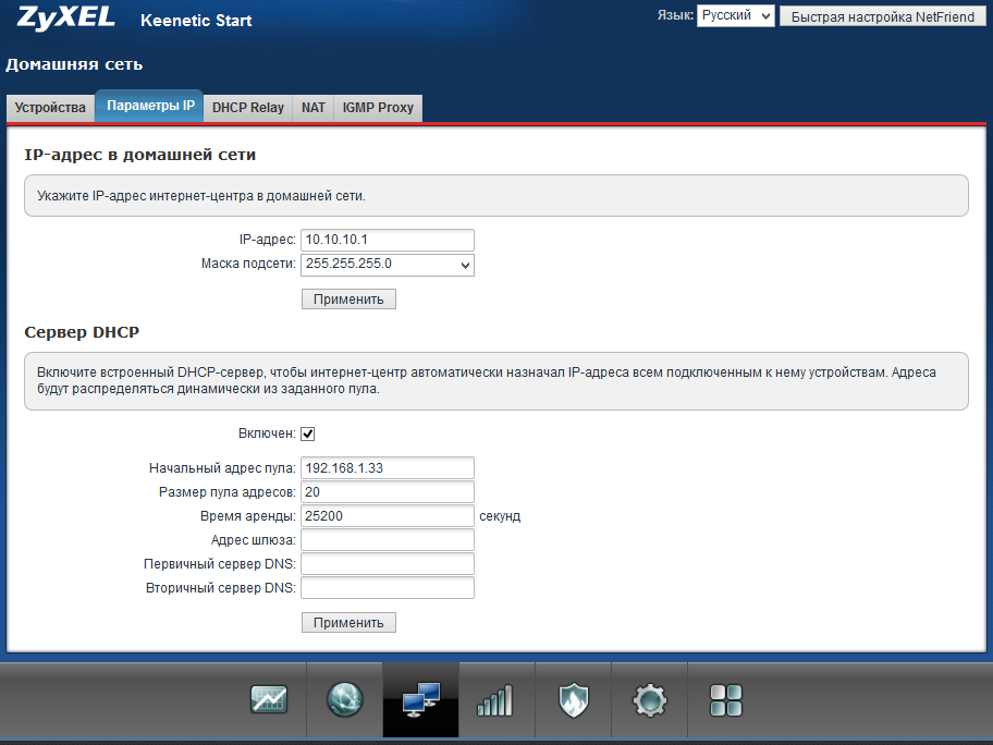1. В разделе Домашняя сеть на закладке Параметры IP следует изменить IP-адрес устройства в локальной сети, выбрав частную подсеть, отличную от настроенной на основном роутере (т.е. отличной от 192.168.1.0/24). Указав адрес 10.10.10.1, нажмём Применить. Настройки DHCP-сервера будут изменены автоматически.