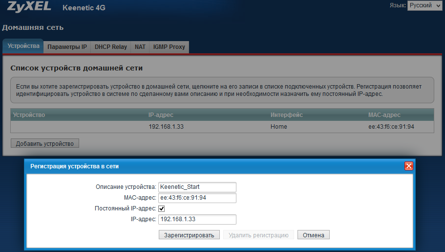 3. Откройте веб-конфигуратор Keenetic 4G по адресу 192.168.1.1. Зафиксируйте IP-адрес, который получил интернет-центр Keenetic Start (клиент Wi-Fi) для выполнения в дальнейшем настройки статической маршрутизации. В меню Домашняя сеть на закладке Устройства нужно выполнить регистрацию выданного беспроводному клиенту IP-адреса. Теперь данному клиенту Wi-Fi всегда будет присваиваться один и тот же указанный IP-адрес.