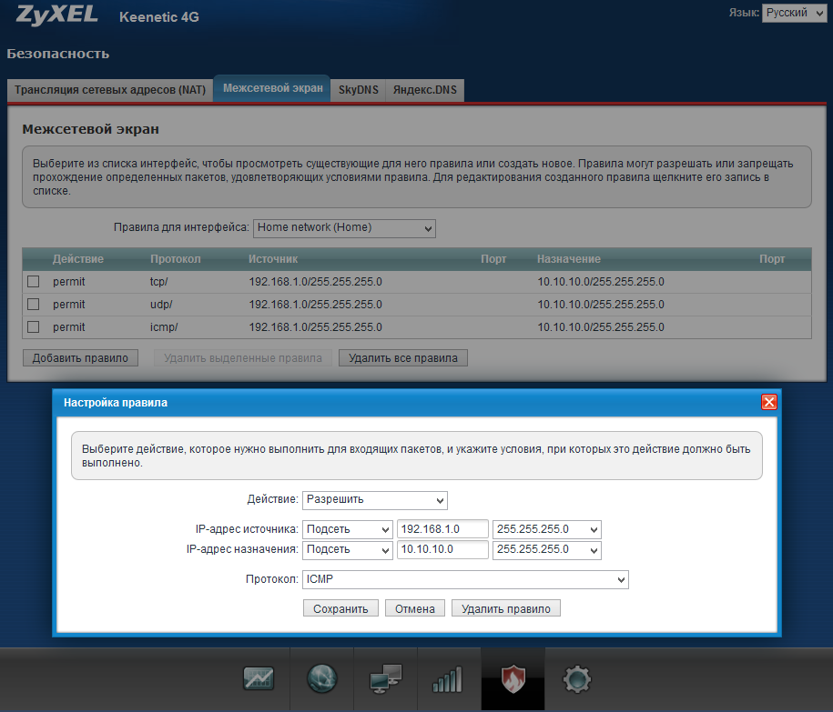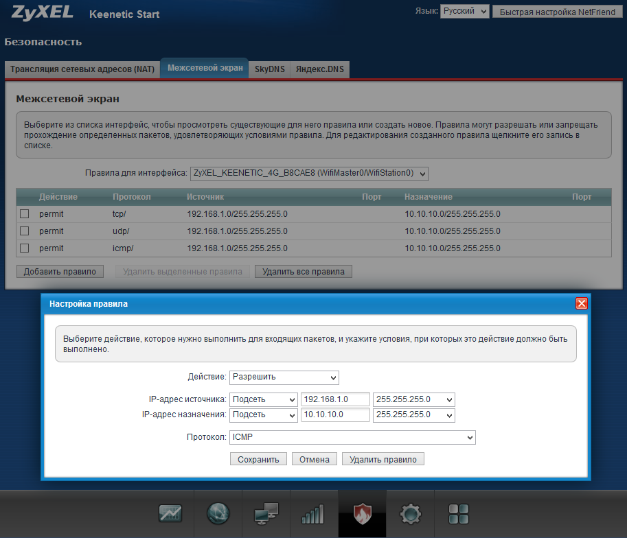 4. Для того чтобы от хостов в Домашней сети интернет-центра Keenetic 4G могли передаваться обращения к сети 10.10.10.0/24 (к сети интернет-центра Keenetic Start), дополнительно нужно настроить Межсетевой экран.