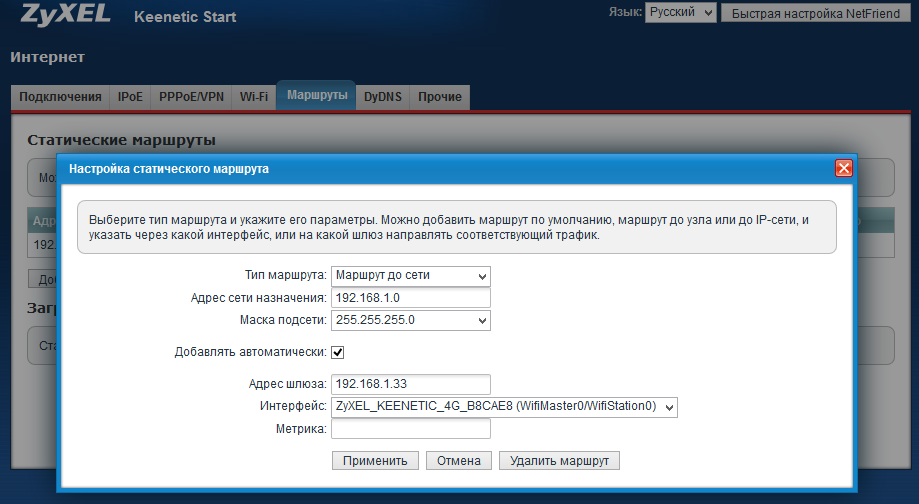 6. Для случая классической маршрутизации (т.е. без NAT) статический маршрут следует указать и на Keenetic Start. При установке в настройках беспроводного клиента Wi-Fi (пункт 2) галочку в поле Использовать для выхода в Интернет ставить не нужно, так как интерфейсу автоматически будет назначен маршрут по умолчанию. Если данный параметр не включать, появляется возможность настроить маршрутизацию в соответствии с требованиями. Например, для доступа к домашней сети роутера Keenetic 4G нужно включить маршрут как на приведённом ниже снимке.