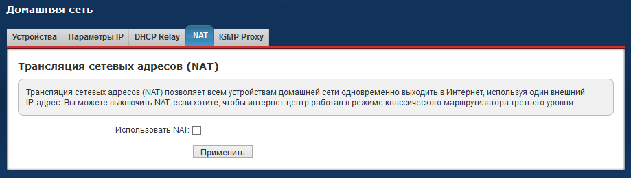 8. На этом предварительные настройки завершены. Теперь на устройстве можно выключить функцию трансляции сетевых адресов NAT для локальной сети. Это можно сделать в меню Домашняя сеть > NAT.