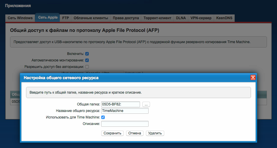 Щелкните мышкой по записи подключенного накопителя. Откроется окно Настройка общего сетевого ресурса, в котором вы можете указать Название общего ресурса. Для работы резервирования нужно установить галочку Использовать для Time Machine (в поле Общая папка вы можете указать конкретную папку для работы Time Machine). Затем нажмите кнопку Сохранить.