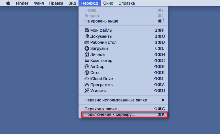 После этого необходимо перейти к настройкам операционной системы Mac OS. В верхней строке выберите пункт Переход > Подключение к серверу.