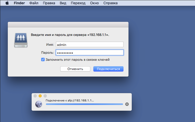 В открывшемся окне в поле Адрес сервера укажите адрес интернет-центра Keenetic в локальной сети в формате afp://ip-адрес (в нашем примере это afp://192.168.1.1). Затем нажмите кнопку Подключиться.