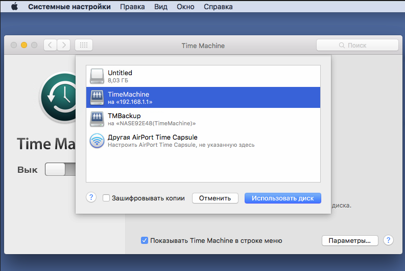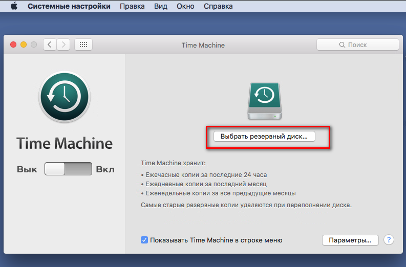 В открывшемся окне Time Machine нажмите Выбрать резервный диск.