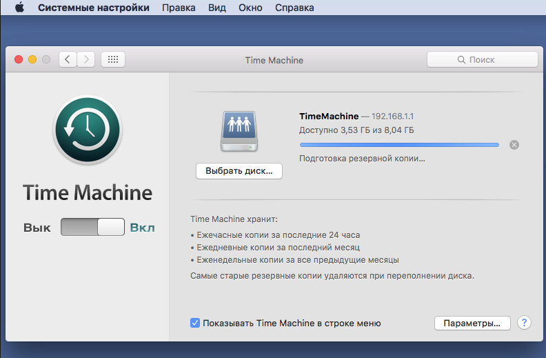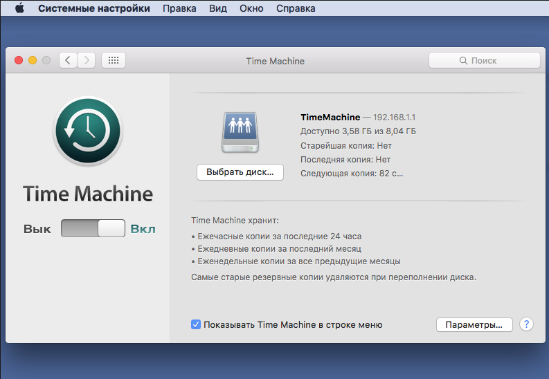 После подключения Time Machine перейдет в положение Вкл, появится информация об объеме, доступном для резервного копирования, а в поле Следующая копия будет отображаться время до начала следующего резервного копирования, отсчет которого начнется со 120 секунд.