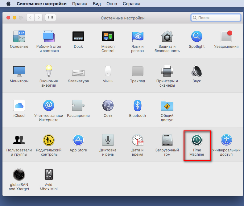 Откроется окно, в котором нужно найти пункт Time Machine и запустить его.