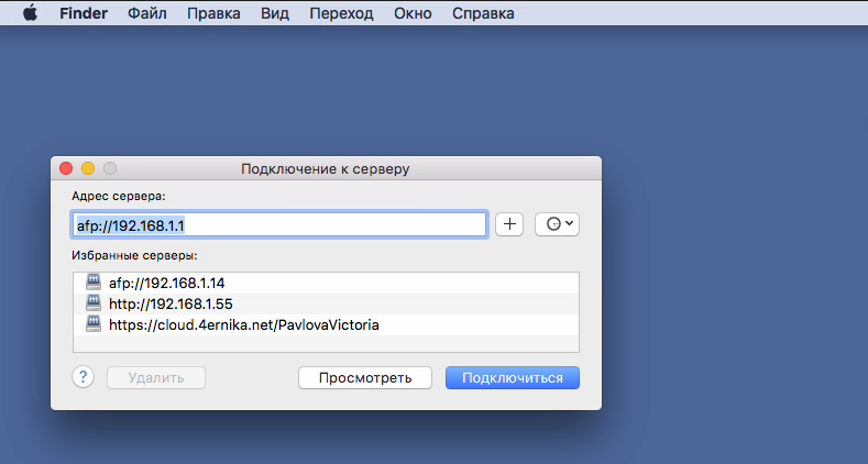 В открывшемся окне в поле Адрес сервера введите адрес интернет-центра Keenetic в локальной сети в формате afp://ip-адрес (в нашем примере это afp://192.168.1.1).