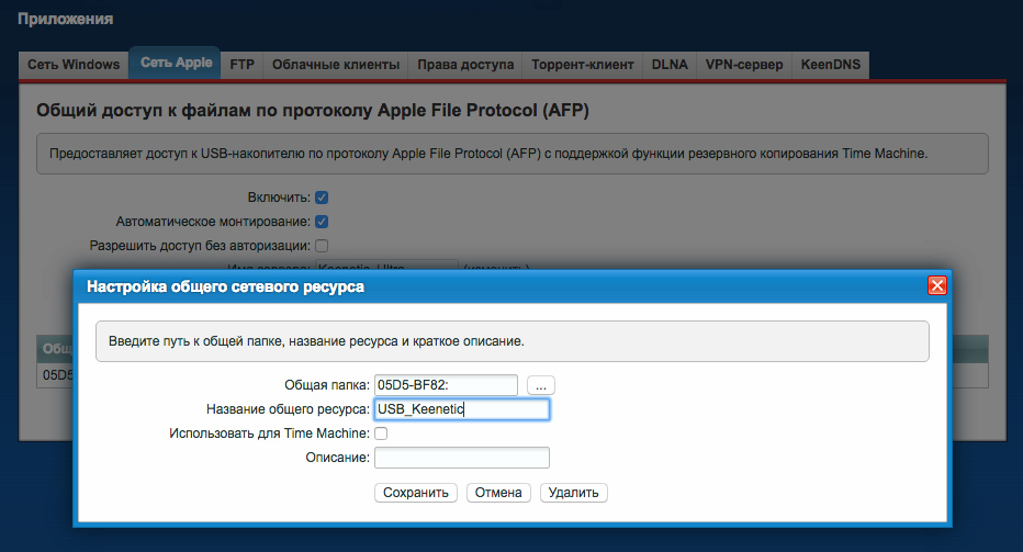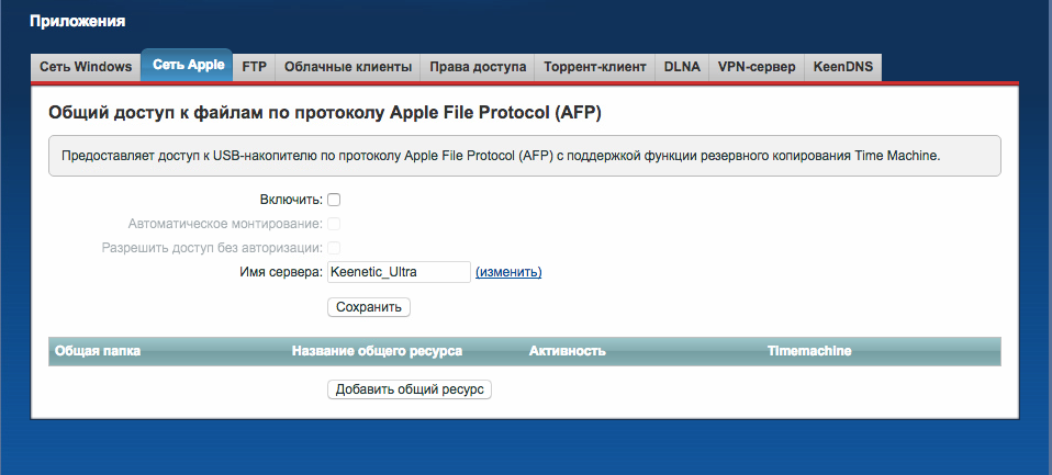 NOTE: В данной статье показана настройка версий ОС NDMS 2.11 и более ранних. Настройка актуальной версии ПО представлена в статье "Сеть Apple (доступ к файлам)".