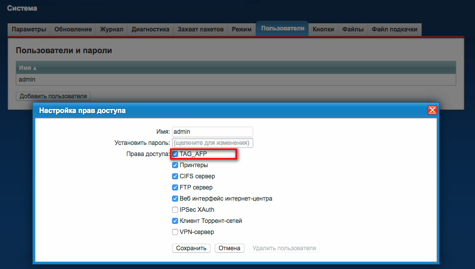 Если галочка Разрешить доступ без авторизации не установлена, в настройках прав пользователя (в меню Система > Пользователи) должна стоять галочка для TAG_AFP.