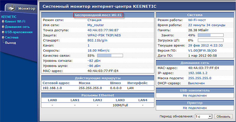 Шаг 7. После успешного подключения на вкладке Монитор в разделе Беспроводной мост Wi-Fi вы увидите сведения о беспроводной сети.