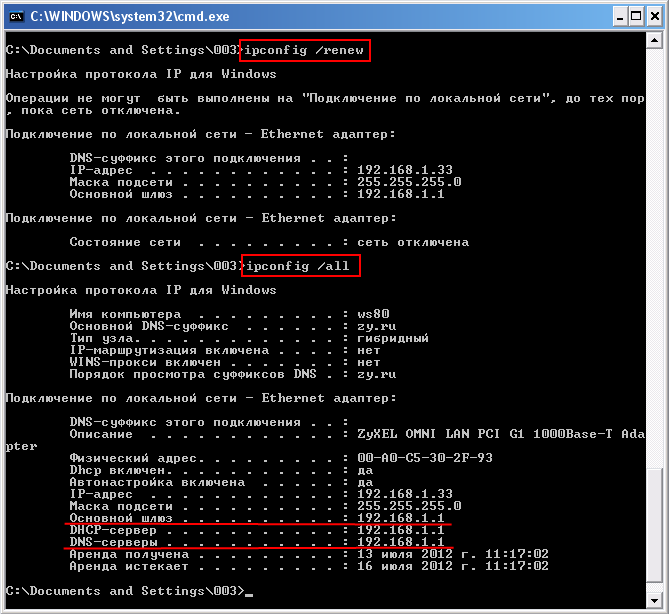 После выполнения указанных выше настроек необходимо будет обновить IP-адрес на сетевой карте компьютера. Для этого, в операционной системе Windows Vista/7 откройте Командную строку (cmd.exe) и выполните команду ipconfig /renew (в ОС Windows 2000/XP/2003 сначала нужно выполнить команду ipconfig /release, а затем ipconfig /renew).