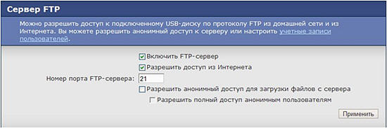 Необходимо установить галочку в полях "Включить FTP-сервер", "Разрешить доступ из Интернета" и указать номер порта FTP-сервера (порт 21 используется по умолчанию и является зарезервированным).