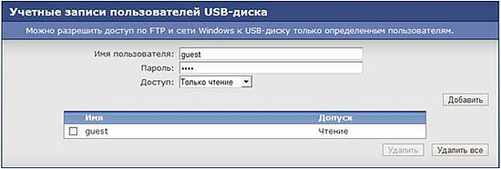 На вкладке Учетные записи можно создать аккаунты для подключения к FTP-серверу и задать права доступа (привилегии). В нашем примере создана учетная запись guest (гость) с правами на чтение файлов с накопителя.