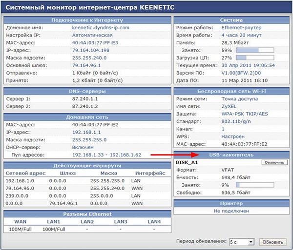Подключившись, вы увидите окно статуса (системный монитор). Убедитесь, что ваш USB-накопитель, подключенный к интернет-центру, определен устройством.