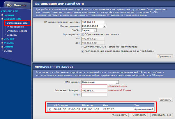 В разделе Арендованные адреса в таблице DHCP-клиентов установите галочку в нужной строке и нажмите кнопку Фиксировать.