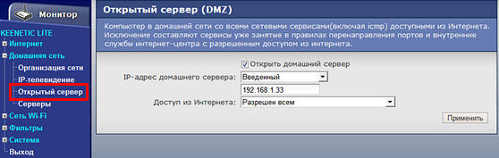 На устройстве также имеется функция открытого сервера (DMZ), где вы можете прописать адрес локального сервера, на который будут перенаправляться все входящие запросы. Исключения будут составлять правила, созданные в меню Перенаправление портов, и порты управления устройством.