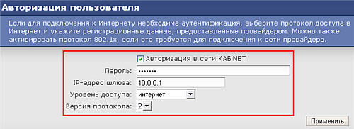 Ранее пользователи оператора КАБiNET запускали программу-авторизатор для подключения к сети на своем компьютере. Теперь (после добавления авторизатора в Keenetic) можно запускать авторизатор непосредственно на интернет-центре, и доступ в Интернет будет постоянно обеспечен для любого подключенного к интернет-центру сетевого устройства, такого как IP-камера, IP-телефон или NAS. При этом на компьютере запускать авторизатор больше не нужно. В отличие от используемой в сети этого провайдера авторизации через PPTP, способ подключения через встроенный авторизатор не накладывает никаких, кроме тарифных, дополнительных ограничений на скорость работы с Интернетом.