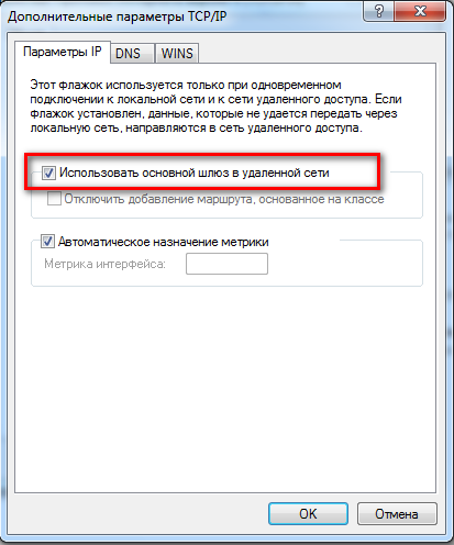 Чтобы трафик маршрутизировался в VPN-туннель от PPTP-клиента в удаленную подсеть за PPTP-сервером и в сеть Интернет, нужно в настройках PPTP-подключения обязательно установить галочку в поле Использовать основной шлюз в локальной сети (по умолчанию эта галочка установлена). Щелкните правой кнопкой мыши на созданном PPTP-подключении Keenetic_ PPTP, затем нажмите Свойства > Сеть > Протокол интернет версии 4 (TCP/IPv4) > Свойства > Дополнительно.