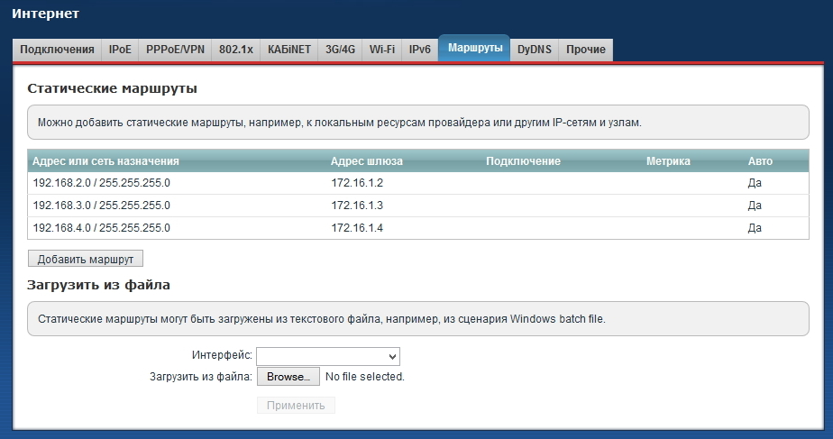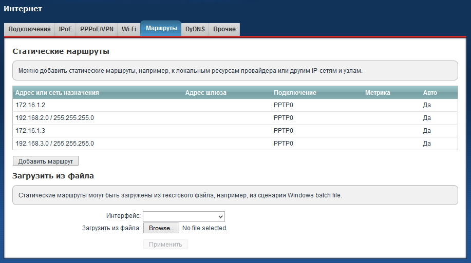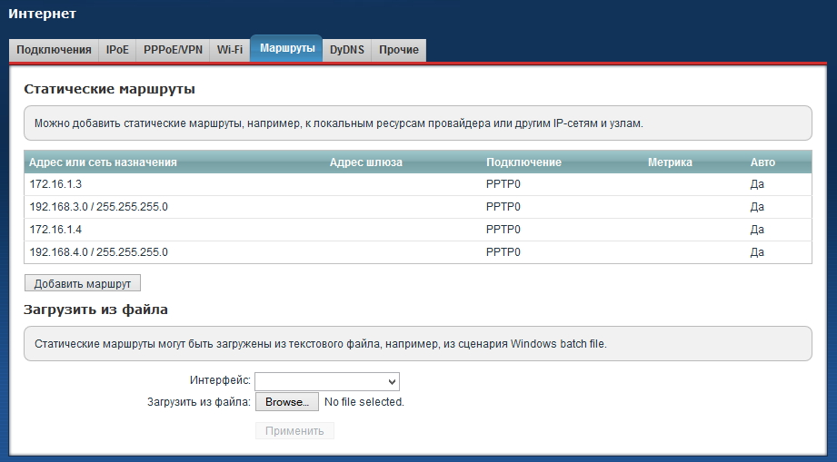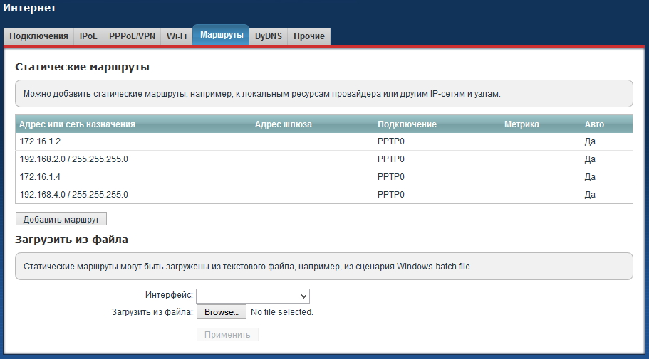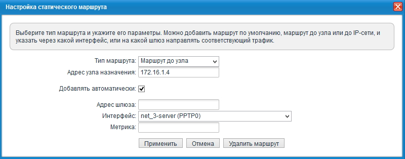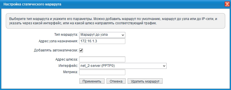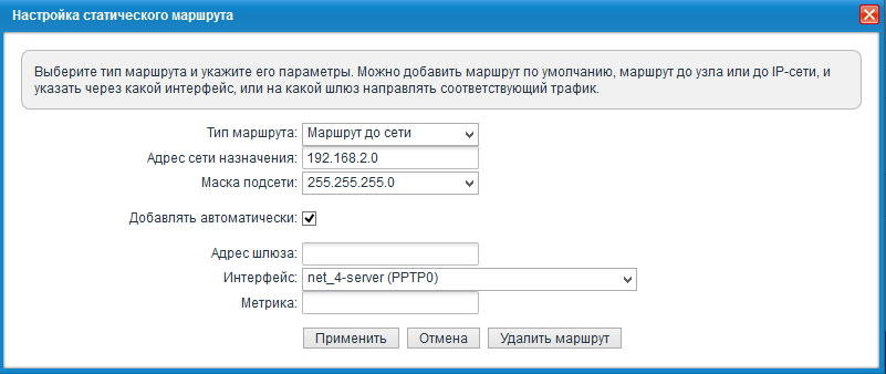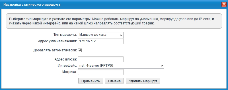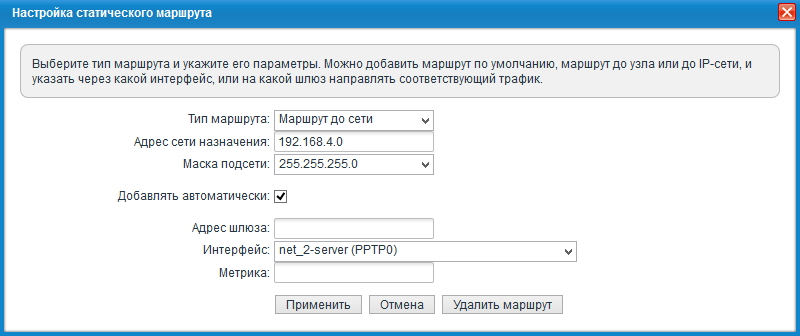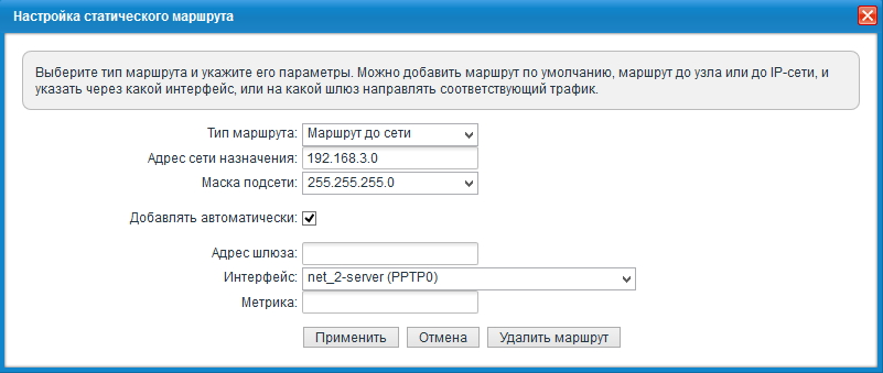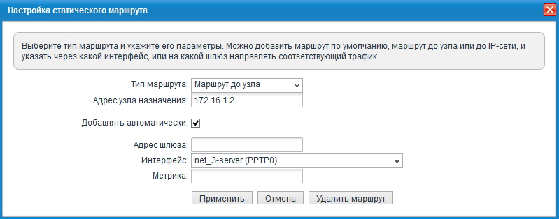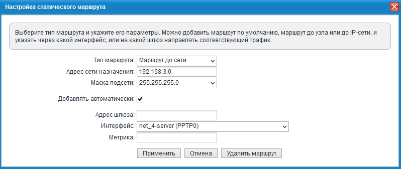 Статические маршруты на главном интернет-центре (с сервером VPN) будут включать следующие записи: для каждой из объединяемых сетей, кроме Домашней сети самого сервера, требуется в качестве адреса шлюза указать IP-адрес, выделенный соответствующему пользователю сервером VPN.