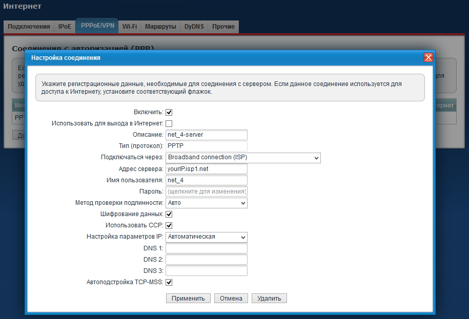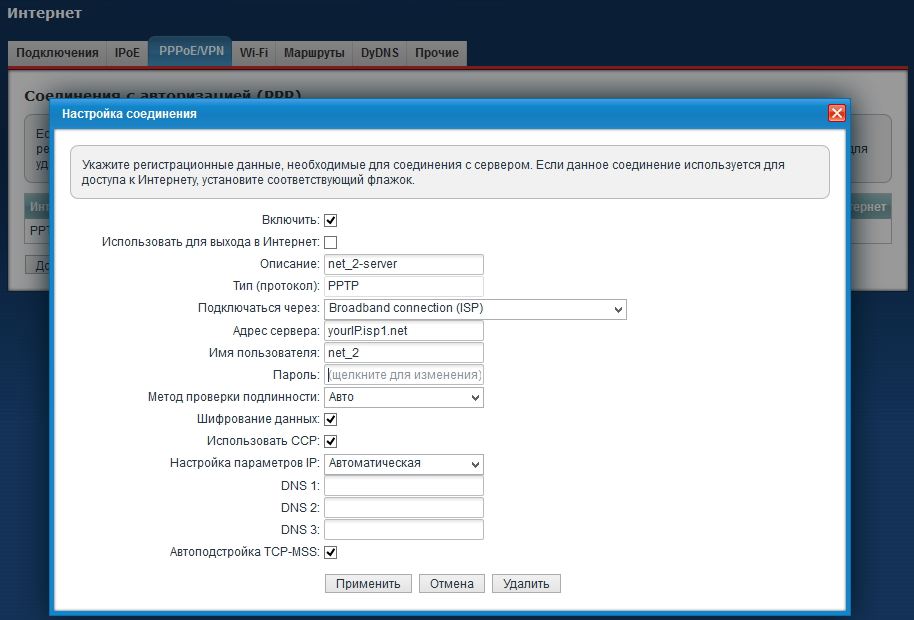Далее приведены настройки PPTP-подключения к серверу и маршрутизации на устройствах — клиентах VPN в схеме, слева направо.