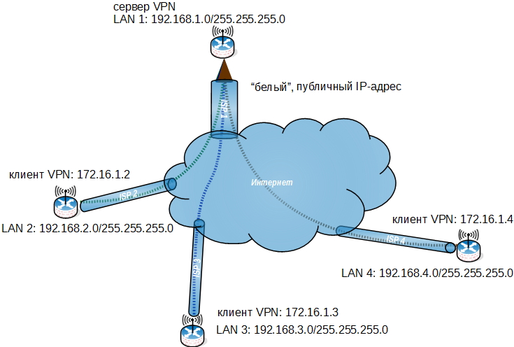 Пусть домашняя сеть LAN 1 подключена к Интернету через "белый" публичный IP-адрес и находится за интернет-центром с Сервером PPTP. Каждая из сетей LAN 2-4 будет подключаться к серверу VPN при помощи PPTP-соединения. Основная задача состоит в обеспечении доступа между всеми объединяемыми сетями LAN 1-4.