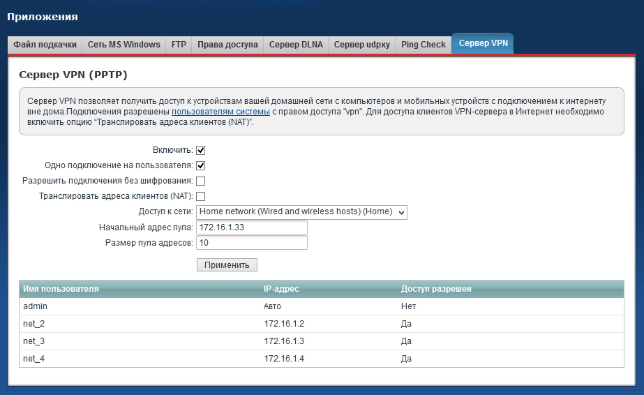 В нашем примере главный интернет-центр (с сервером VPN) будет являться концентратором VPN-подключений (с ним будут устанавливаться все PPTP-подключения, и через него будет осуществляться маршрутизация между всеми подключенными подсетями). В настройках главного интернет-центра потребуется создать столько учетных записей пользователей с правами доступа vpn, сколько сетей вы планируете объединить (в нашем примере для 3 удаленных подсетей созданы 3 учетные записи – net_2, net_3 и net_4).