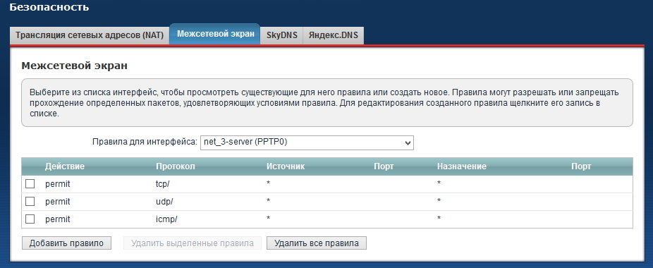 3. Поскольку на интерфейсе PPTP-клиента по умолчанию включен межсетевой экран, блокирующий все входящие соединения, в настройках клиентских интернет-центров потребуется открыть нужные для работы порты/протоколы. В меню Безопасность > Межсетевой экран нужно создать соответствующие разрешающие правила для входящих подключений по любым протоколам (как правило, достаточно будет открыть доступ по протоколам tcp/icmp/udp). Об этом также написано в статье «Объединение двух локальных сетей при помощи интернет-центров, используя встроенное приложение Сервер VPN»