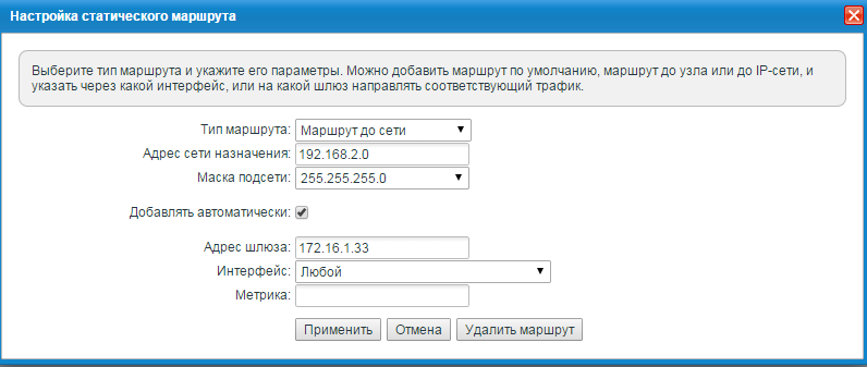 3. Также нужно добавить статический маршрут в меню Интернет - Прочее на подсеть 192.168.2.0/24 через IP-адрес, который мы зарезервировали в предыдущем пункте (в нашем примере это IP-адрес 172.16.1.33).