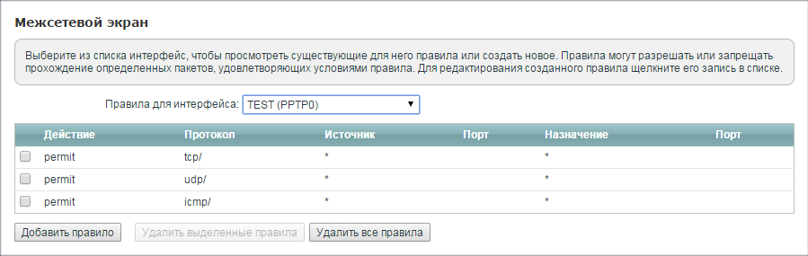 5. Также для интерфейса PPTP0 необходимо разрешить прохождение трафика в меню Безопасность - Межсетевой экран.