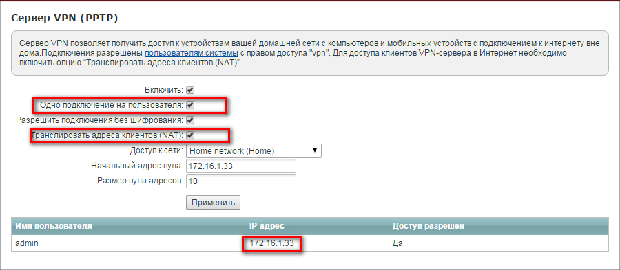 2. В Keenetic Giga II нужно дополнительно в настройках VPN-сервера (в меню Приложения - Сервер VPN) включить механизм NAT для клиентов (Транслировать адреса клиентов), использовать функцию Одно подключение на пользователя и прописать статический IP-адрес для клиента, под которым будет подключаться Keenetiс Omni.