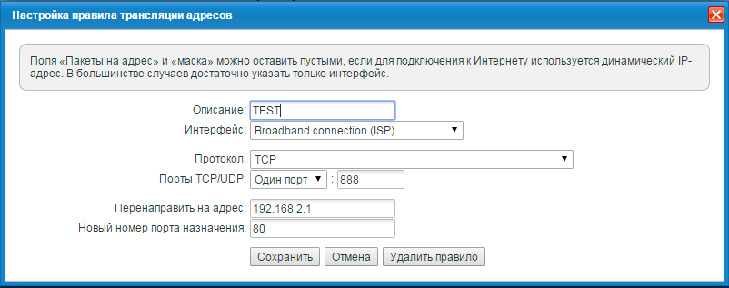 В нашем примере выполним проброс внешнего порта 888 на локальный IP-адрес интернет-центра Keenetic Omni и порт 80 для доступа к его веб-интерфейсу.