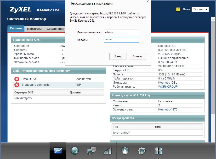 Далее авторизуйтесь на модеме с логином и новым паролем.