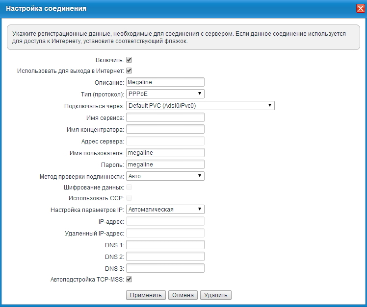 Для настройки интерфейса ADSL-доступа в Интернет перейдете в раздел Интернет > ADSL и щелкните по записи интерфейса.