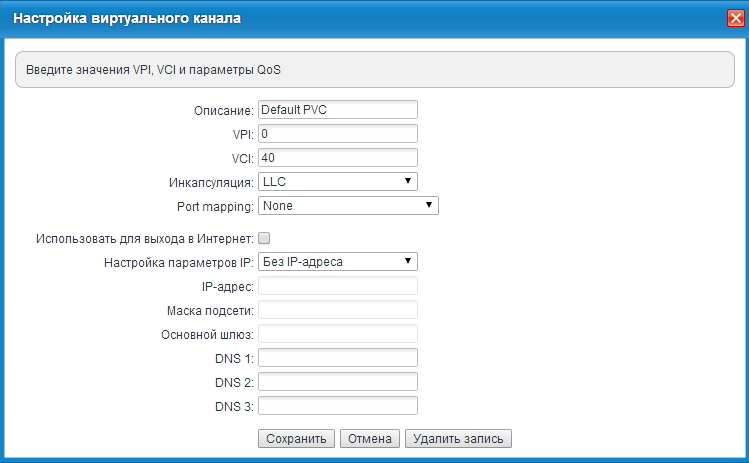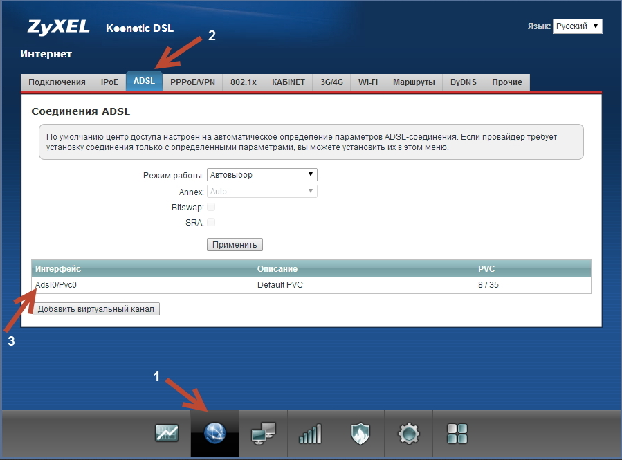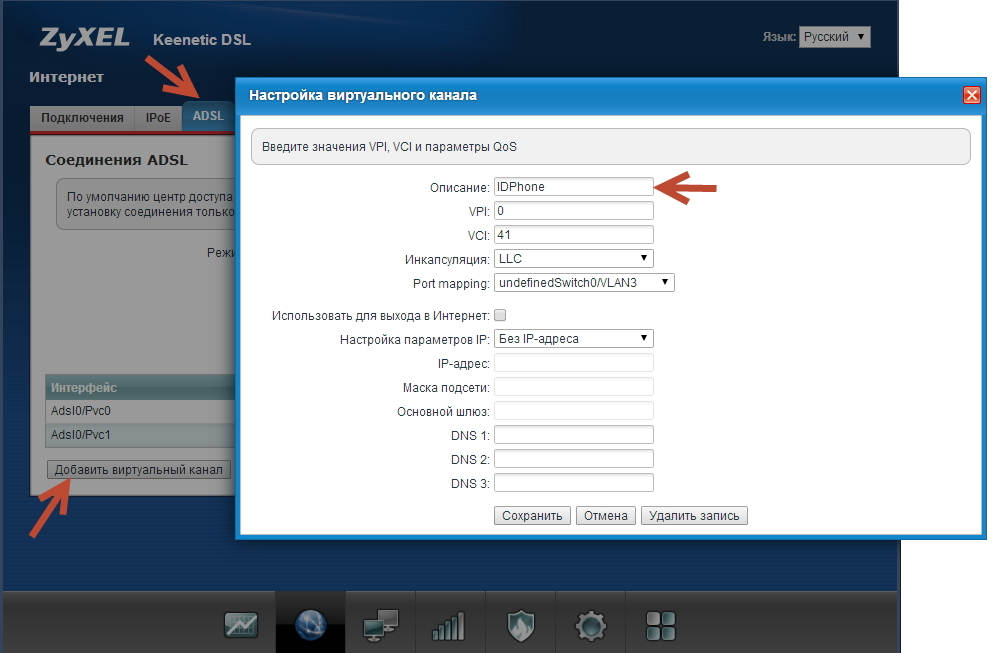 Далее перейдите в раздел ADSL и добавьте виртуальные каналы.