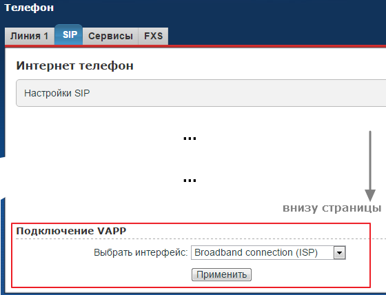 Данную настройку можно выполнить в веб-конфигураторе интернет-центра в меню Телефон на вкладке SIP в подразделе Подключение VAPP в поле Выбрать интерфейс.
