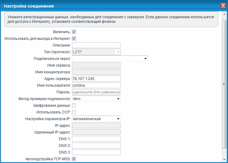 2. Настройте основное IPv4-подключение к интернет-провайдеру. В нашем примере используется подключение к тестовому серверу "Билайн" по протоколу L2TP.