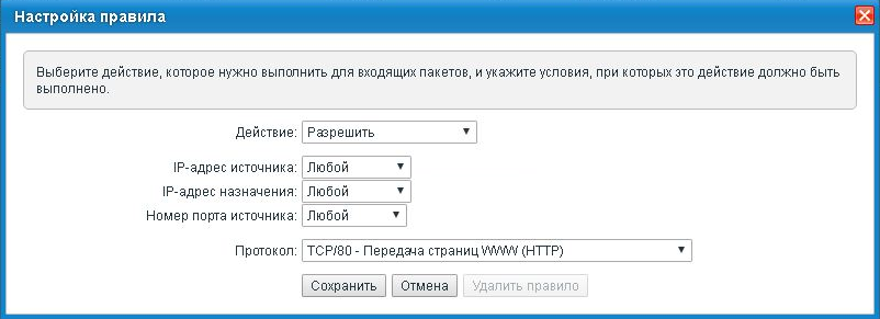 На скриншоте ниже показан пример правила на внешнем интерфейсе (WAN), разрешающего управление интернет-центром по протоколу HTTP из Интернета.