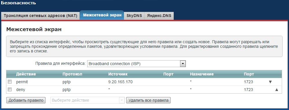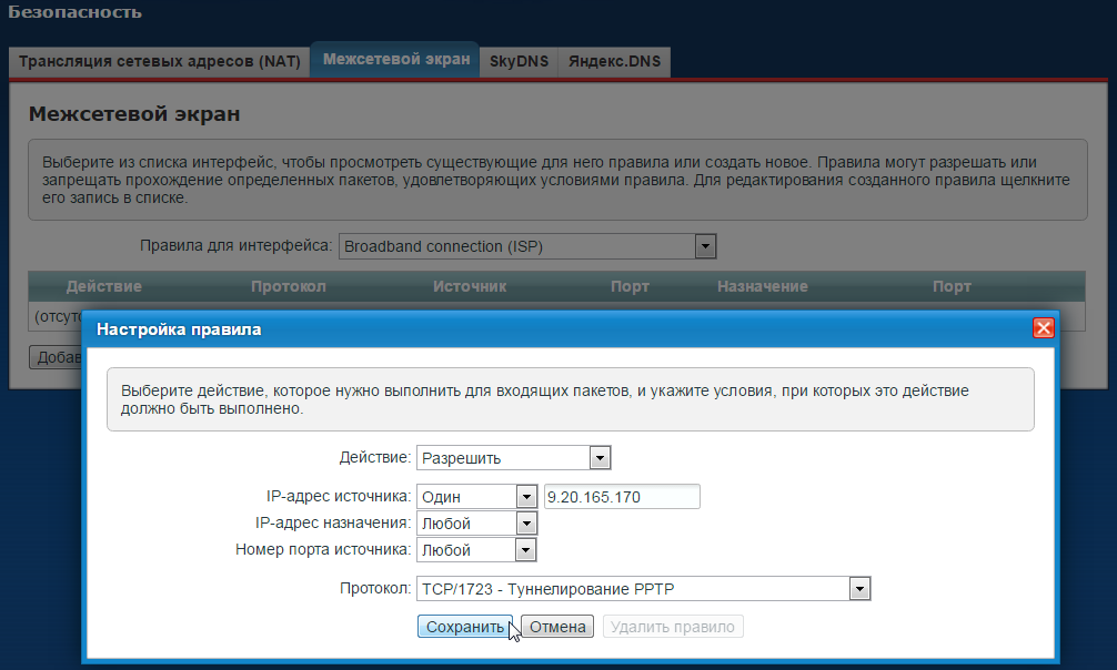 Эти два простые правила запрещают любые PPTP-подключения на интерфейсе ISP, кроме как с адреса 9.20.165.170.