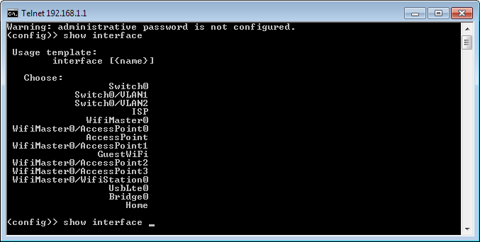 Список названия интерфейсов устройства и их системные идентификаторы можно посмотреть следующим образом: впишите команду show interface и затем нажмите клавишу TAB на клавиатуре. На экран будет выведен список всех имеющихся на текущий момент интерфейсов устройства, включая предустановленные служебные.