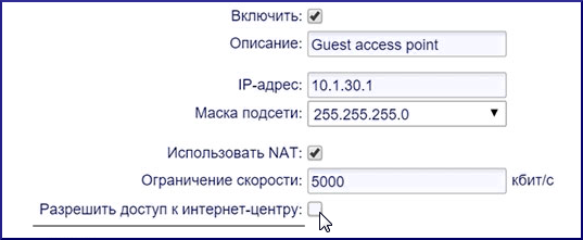 По умолчанию Keenetic принимает сетевые подключения только с интерфейсов private. Интерфейсам типа private разрешено устанавливать соединения в интерфейсы public, и на само устройство для управления и доступа к сервисам, работающим на интернет-центре. Для интерфейса гостевой сети закрыт доступ для управления интернет-центром и к его сервисам.