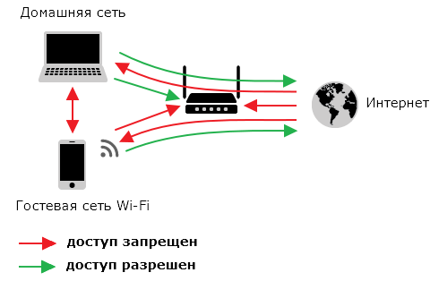 По умолчанию Keenetic принимает сетевые подключения только с локальных интерфейсов. Из домашних интерфейсов разрешено устанавливать соединения в публичные интерфейсы, и на само устройство для управления и доступа к сервисам, которые включены на интернет-центре (FTP, Transmission, сетевое использование USB-накопителей и т.п.). Для клиентов гостевой сети закрыт доступ для управления интернет-центром и к его сервисам.