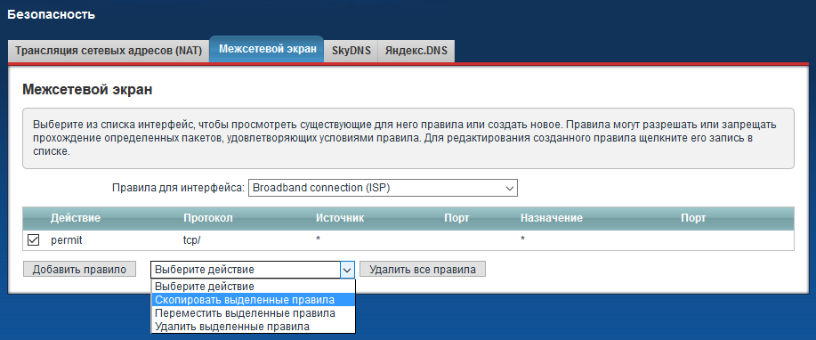 Веб-интерфейс интернет-центра предлагает наиболее удобный способ управления правилами сетевого экрана. Но он имеет ограничение: созданные через веб-конфигуратор правила применяются только к входящему (in) направлению, настроить исходящее (out) направление невозможно! Через интерфейс командной строки (CLI) интернет-центра возможно создавать правила для любого направления.