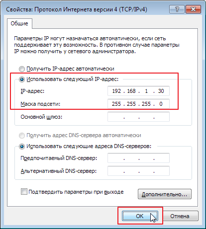 На компьютере в настройках сетевого подключения вручную установите использовать IP-адрес из диапазона 192.168.1.4 ~ 192.168.1.254 с маской 255.255.255.0 (в нашем примере мы установили IP-адрес 192.168.1.30).