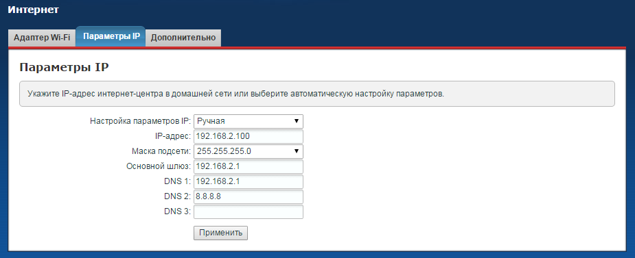 В нашем примере устройству был назначен статический IP-адрес 192.168.2.100 (по этому адресу теперь будет доступен веб-конфигуратор), а IP-адрес 192.168.2.1 это адрес вышестоящего главного роутера (интернет-центра).