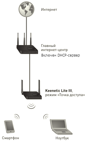 Внимание! Для нормальной работы режима "Точка доступа" требуется, чтобы в сети, к которой будет подключен Keenetic Lite III, работал DHCP-сервер (это также относится к режимам "Усилитель" и "Адаптер"). Т.е. необходимо, чтобы главный роутер (интернет-центр) автоматически присваивал IP-адреса клиентским устройствам в сети.