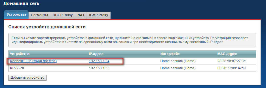 В нашем примере Keenetic Lite III, который работает в режиме "Точка доступа", получил IP-адрес 192.168.1.34. По этому IP-адресу он и будет доступен из локальной сети. Далее можно будет зайти в его веб-интерфейс и внести дополнительные настройки, например название сети Wi-Fi.